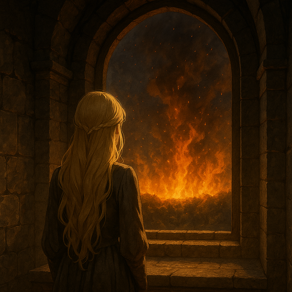 [Picture] As the sun dipped below the horizon, darkness enveloped her world—only to be broken hours later by the roaring blaze that consumed everything in its path. Flames licked hungrily at the castle...