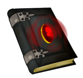 He utilizes a large tome with a bright red glowing gem upon the cover. This is his own personal spell book containing all of the secrets of Aetherealm he himself has been able to discover.